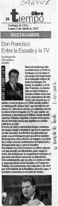 Don Francisco, entre la espada y la TV [artículo] La Hora de la Tarde (Santiago) abr. 1, 2002, p. 15 retr. .