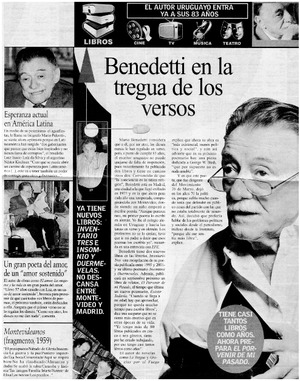 Benedetti en la tregua de los versos. [artículo] La Hora (Santiago, Chile : 1935)-- jul. 21, 2003, p. 25. retr. .