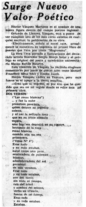 Surge nuevo valor poético. [artículo] La Mañana (Talca, Chile)-- jun. 30, 1981, p. 5. .