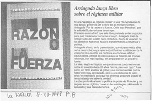Arriagada lanza libro sobre el régimen militar [artículo]. La Nación.-- jul. 8, 1998, p. 8. il. .