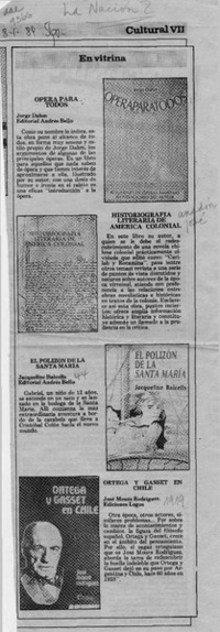 En vitrina [artículo]. La Nación. -- ene. 8, 1989, p. VII retr. .
