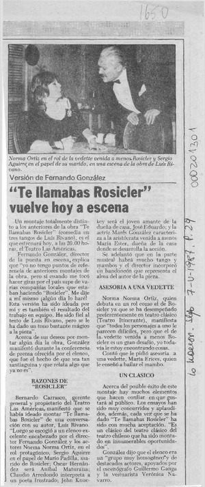 "Te llamabas Rosicler" vuelve hoy a escena [artículo]. La Nación. -- mayo 7, 1987, p. 29 retr. .