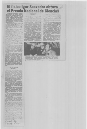 El físico Igor Saavedra obtuvo el Premio Nacional de Ciencias. [artículo] La Nación (Diario : Santiago, Chile)-- sept. 1, 1981, p. A16. .