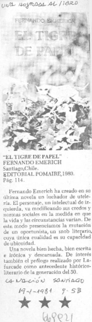 El tigre de papel". [artículo] La Nación (Diario : Santiago, Chile)-- ene. 19, 1981, p. B5. il. .