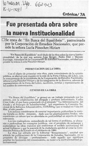 Fue presentada obra sobre la nueva Institucionalidad. [artículo] La Nación (Diario : Santiago, Chile)-- mayo 15, 1981, p. 7A. .
