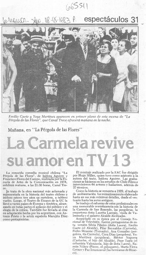 La Carmela revive su amor en TV 13. [artículo] La Nación (Diario : Santiago, Chile)-- sept. 18, 1983, p. 31. retr. .