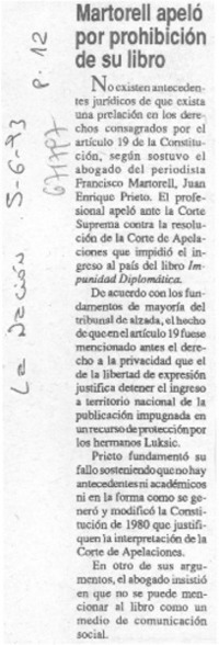 Martorell apeló por prohibición de su libro. [artículo] La Nación (Diario : Santiago, Chile)-- jun. 5, 1993, p. 12. .