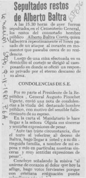 Sepultados restos de Alberto Baltra. [artículo] La Nación (Diario : Santiago, Chile)-- sept. 9, 1981, p. 6A. .