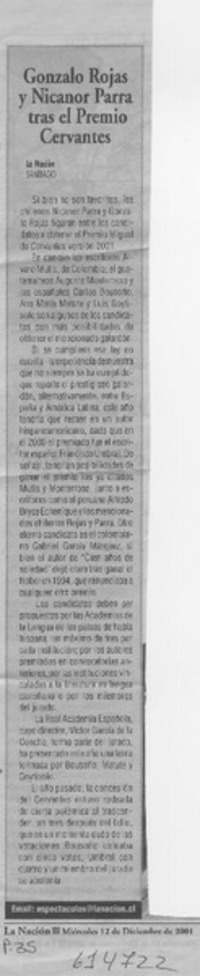 Gonzalo Rojas y Nicanor Parra tras el Premio Cervantes [artículo] La Nación (Santiago) dic. 12, 2001, p. 35 .