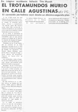 El Trotamundos murió en calle Agustinas. [artículo] La Nación (Santiago, Chile)-- jun. 11, 1971, p. 6. .