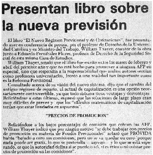 Presentan libro sobre la nueva previsión. [artículo] La Nación (Santiago, Chile)-- jun. 20, 1981, p. A5. .