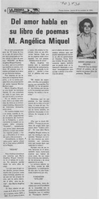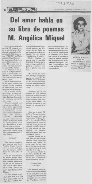 Del amor habla en su libro de poemas M. Angélica Miquel. [artículo] La Prensa Austral (Punta Arenas, Chile)-- oct. 29, 1981, p. 6. retr. .