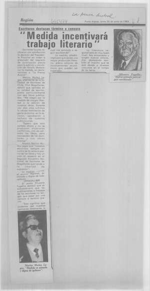 Medida incentivará trabajo literario. [artículo] La Prensa Austral (Punta Arenas, Chile)-- jun. 20, 1983, p. 7. retr. .