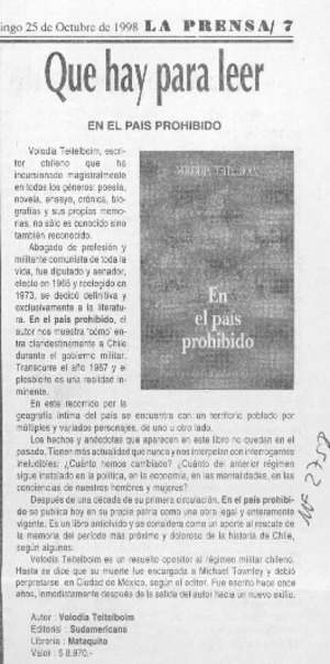 En el país prohibido [artículo]. La Prensa (Curicó). -- oct. 25, 1998, p. 7. il. .