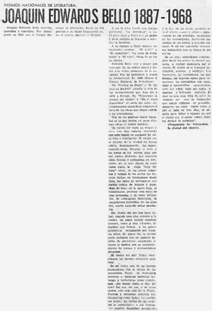 Joaquín Edwards Bello 1887-1968. [artículo] La Prensa (Curicó, Chile)-- sept. 11, 1985, p. 5. .