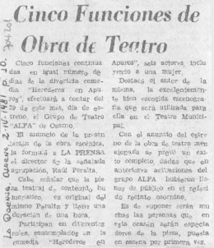 Cinco funciones de obra de teatro. [artículo] La Prensa (Osorno, Chile)-- abr. 2, 1981, p. 10. .