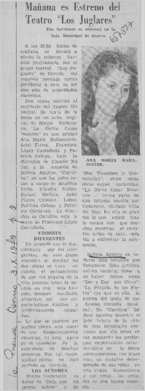 Mañana es estreno del teatro "Los Juglares". [artículo] La Prensa (Osorno, Chile)-- oct. 3, 1979, p. 9. .