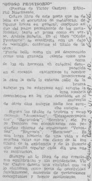 Otoño provisorio". [artículo] La Prensa (Osorno, Chile)-- jun. 5, 1981, p. 10. .