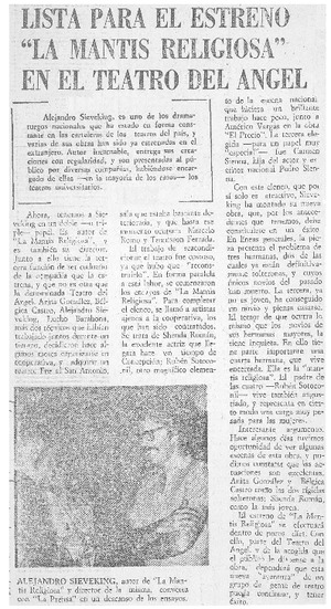 Lista para el estreno "La mantis religiosa" en el teatro del angel. [artículo] La Prensa (Santiago, Chile)-- mayo 4, 1971, p. 16. .