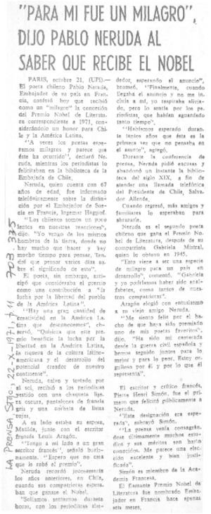"Para mi fue un milagro", dijo Pablo Neruda al saber que recibe el Nobel. [artículo] La Prensa (Santiago, Chile)-- oct. 22, 1971, p. 11. .