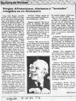 Borges: afirmaciones, aforismos y "boutades" recogidos en un diccionario. [artículo] La Segunda (Diario : Santiago, Chile)-- dic. 15, 1986, p. 5. retr. .