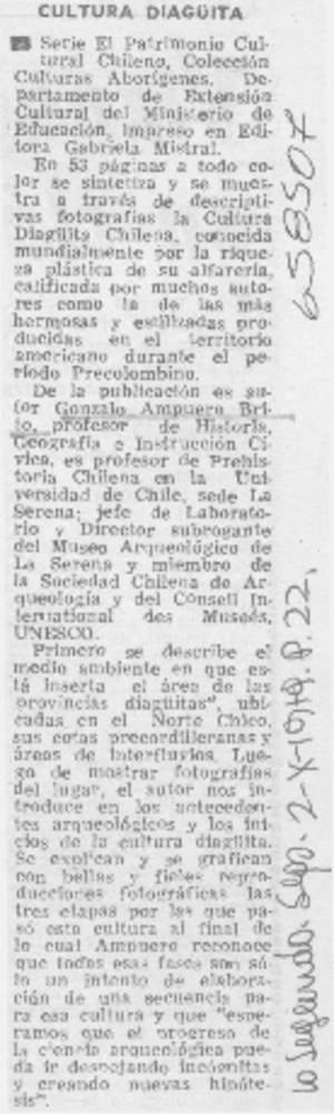 Cultura diaguita. [artículo] La Segunda (Diario : Santiago, Chile)-- oct. 2, 1979, p. 22. .