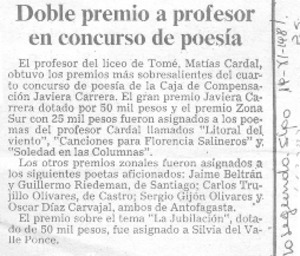 Doble premio a profesor en concurso de poesía. [artículo] La Segunda (Diario : Santiago, Chile)-- nov. 19, 1981, p. 5. .