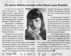 En marzo debuta montaje sobre María Luisa Bombal. [artículo] La Segunda (Diario : Santiago, Chile)-- nov. 7, 2003, p. 65. retr. .