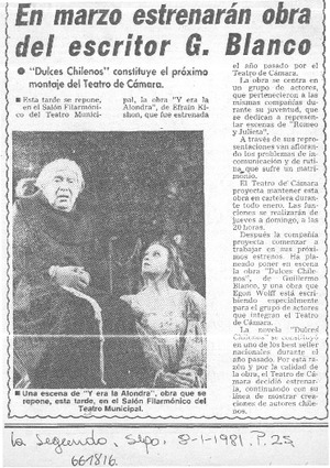 En marzo estrenarán obra del escritor G. Blanco. [artículo] La Segunda (Diario : Santiago, Chile)-- ene. 8, 1981, p. 25. .