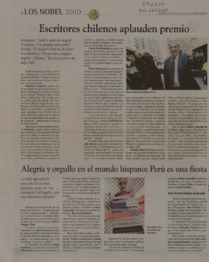 Escritores chilenos aplauden premio [artículo]. La Segunda (Diario : Santiago, Chile)-- oct. 7, 2010, p. 4. .
