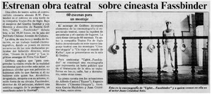Estrenan obra teatral sobre cineasta Fassbinder. [artículo] La Segunda (Diario : Santiago, Chile)-- dic. 2, 1985, p. 26. retr. .