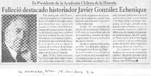 Falleció destacado historiador Javier González Echenique [artículo] La Segunda (Diario : Santiago, Chile)-- ago. 18, 2004, p. 4. retr. .