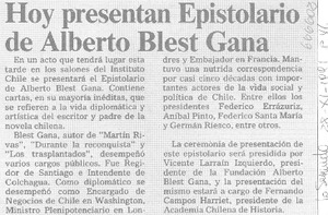 Hoy presentan epistolario de Alberto Blest Gana. [artículo] La Segunda (Diario : Santiago, Chile)-- nov. 28, 1991, p. 46. .