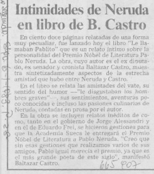 Intimidades de Neruda en libro de B. Castro. [artículo]