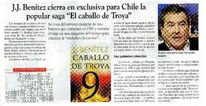 J. J. Benítez cierra en exclusica para Chile la popular saga "El caballo de Troya" [artículo]. La Segunda (Diario : Santiago, Chile)-- nov. 7, 2011, p. 42. .