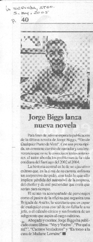 Jorge Biggs lanza nueva novela [artículo] La Segunda (Diario : Santiago, Chile)-- mayo 5, 2005, p. 40. retr. .