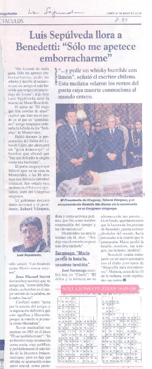 Luis Sepúlveda llora a Benedetti: "Sólo me apetece emborracharme" [artículo]. La Segunda (Diario : Santiago, Chile)-- mayo 18, 2009, p. 34. .