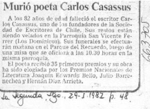 Murió poeta Carlos Casassus. [artículo] La Segunda (Diario : Santiago, Chile)-- ene. 29, 1982, p. 48. .