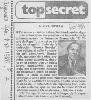 Nueva novela. [artículo] La Segunda (Diario : Santiago, Chile)-- dic. 9, 1980, p. 7. retr. .