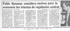 Pablo Hunneus considera nocivos para la economía los intentos de regulación central [artículo] La Segunda (Diario : Santiago, Chile)-- dic. 5, 1980, p. 6. retr. .