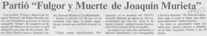 Partió "Fulgor y muerte de Joaquín Murieta". [artículo] La Segunda (Diario : Santiago, Chile)-- mayo 29, 1986, p. 25. .