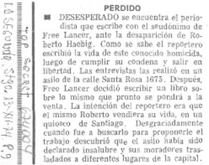 Perdido. [artículo] La Segunda (Diario : Santiago, Chile)-- dic. 13, 1974, p. 9. .