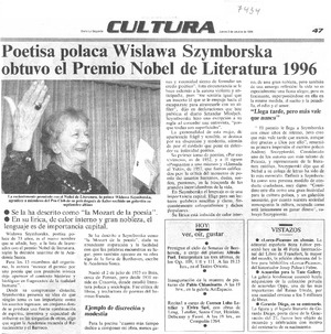 Poetisa polaca Wislawa Szymborska obtuvo el Premio Nobel de Literatura 1996. [artículo] La Segunda (Diario : Santiago, Chile)-- oct. 3, 1996, p. 47. retr. .