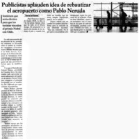 Publicistas aplauden idea de rebautizar el aeropuerto como Pablo Neruda. [artículo] La Segunda (Diario : Santiago, Chile)-- ago. 22, 2003, p. 43. .