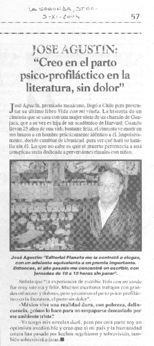 "Creo en el parto psico-profiláctico en la literatura, sin dolor" [artículo] La Segunda (Diario : Santiago, Chile)-- nov. 5, 2004, p. 57. .