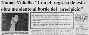 Tomás Vidiella: "con el regreso de esta obra me siento al borde del precipicio". [artículo] La Segunda (Diario : Santiago, Chile)-- abr. 15, 1982, p. 48-49. retr. .
