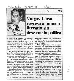 Vargas Llosa regresa al mundo literario sin descartar la política. [artículo] La Segunda (Diario : Santiago, Chile)-- jun. 19, 1990, p. 25. retr. .