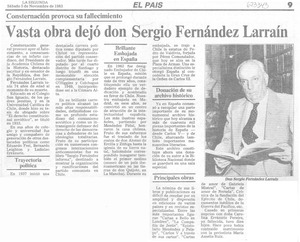 Vasta obra dejó don Sergio Fernández Larraín. [artículo] La Segunda (Diario : Santiago, Chile)-- nov. 5, 1983, p. 9. retr. .