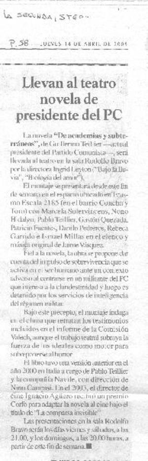 Llevan al teatro novela de presidente del PC. [artículo] La Segunda (Diario: Santiago, Chile)-- abr. 14, 2005, p. 58 .