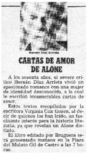 Cartas de amor de Alone. [artículo] La Segunda (Santiago, Chile)-- abr. 24, 1985, p. 5. retr. .